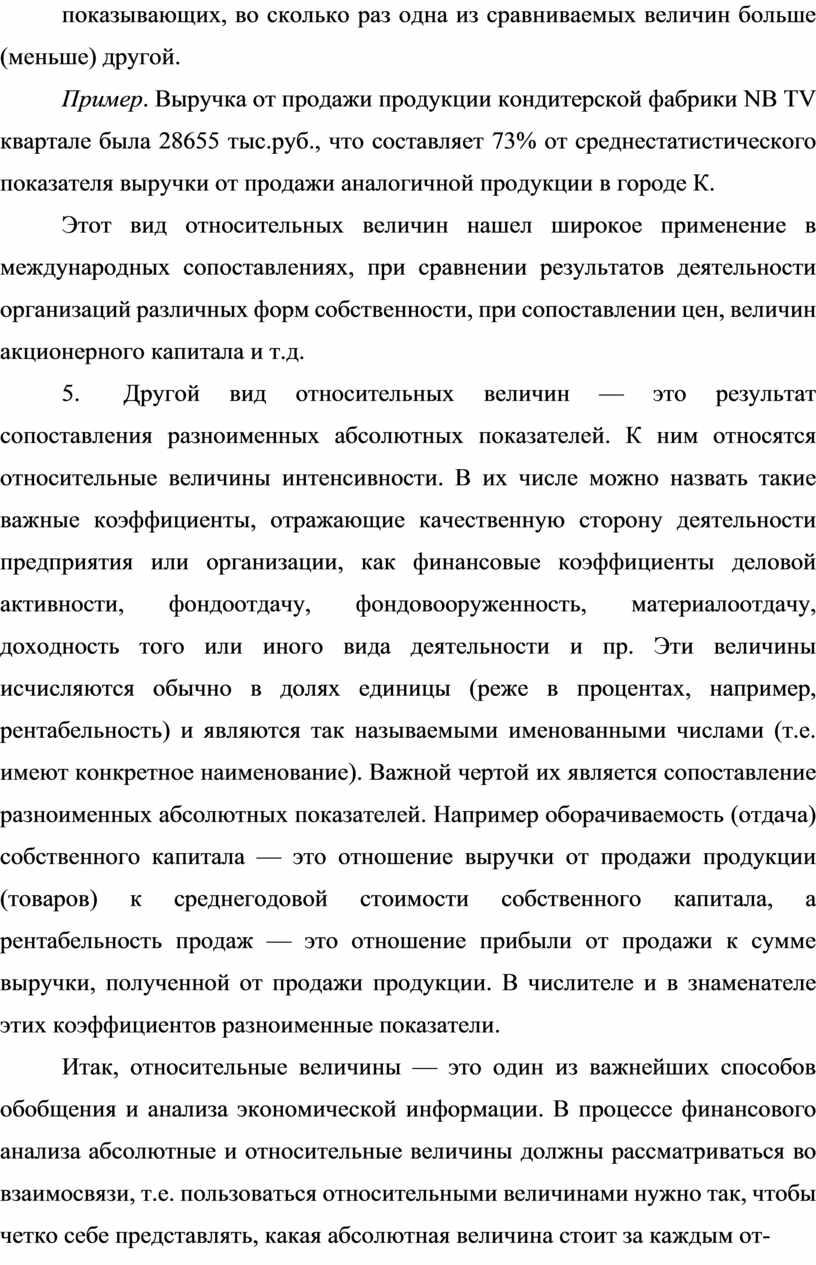 Итак, относительные величины — это один из важнейших способов обобщения и анализа экономической информации. В процессе финансового анализа абсолютные и относительные величины должны рассматриваться во взаимосвязи, т.е. пользоваться относительными величинами нужно так, чтобы четко себе представлять, какая абсолютная величина стоит за каждым от-