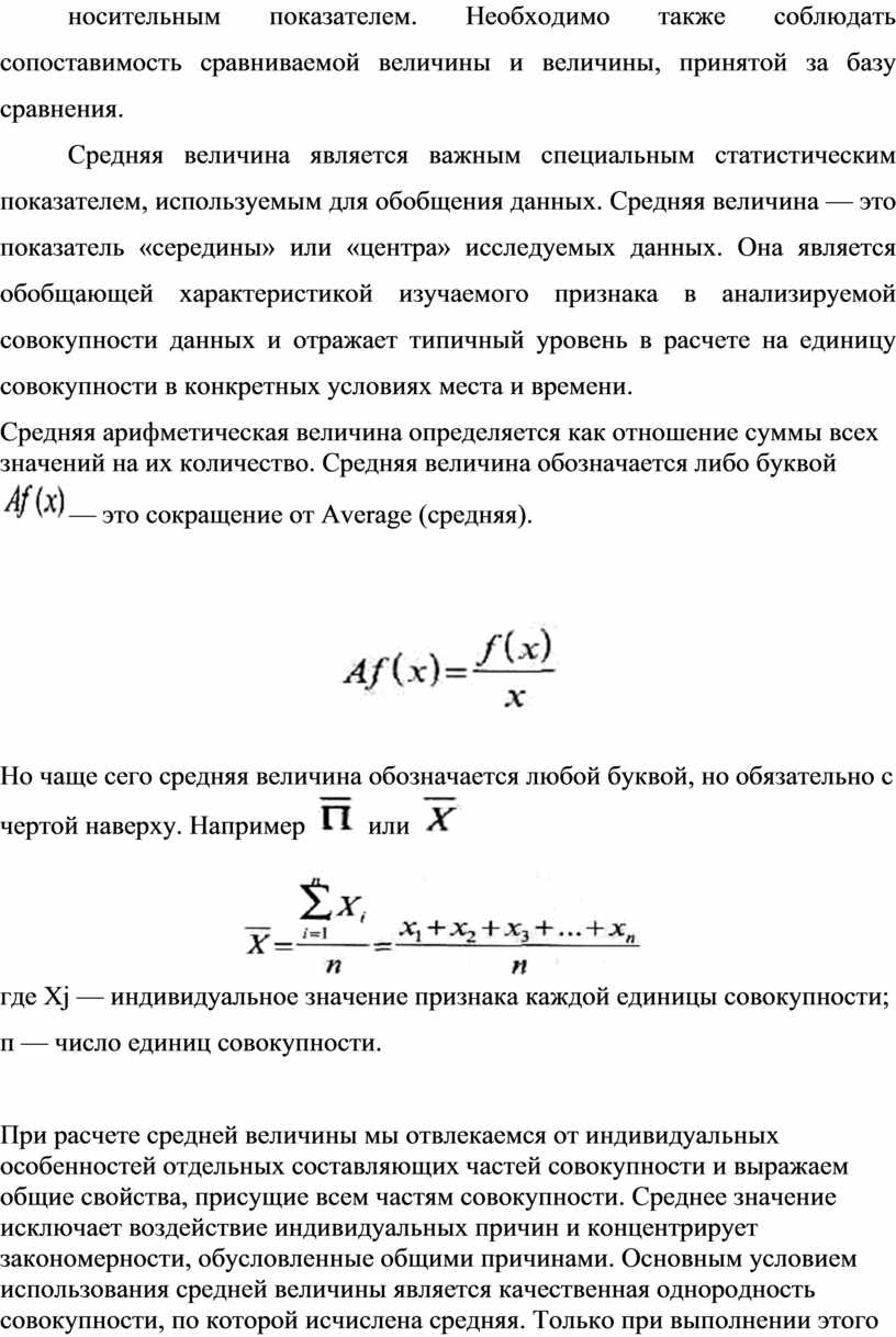 При расчете средней величины мы отвлекаемся от индивидуальных особенностей отдельных составляющих частей совокупности и выражаем общие свойства, присущие всем частям совокупности. Среднее значение исключает воздействие индивидуальных причин и концентрирует закономерности, обусловленные общими причинами. Основным условием использования средней величины является качественная однородность совокупности, по которой исчислена средняя. Только при выполнении этого условия средняя величина отражает общее, типичное, закономерное, присущее всем частям анализируемой совокупности.