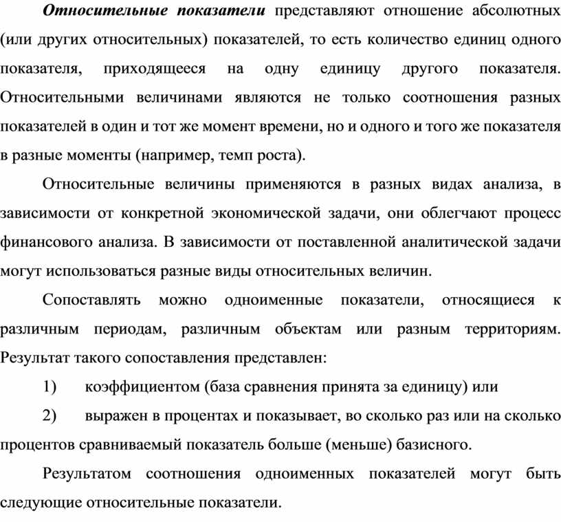 Относительные показатели представляют отношение абсолютных (или других относительных) показателей, то есть количество единиц одного показателя, приходящееся на одну единицу другого показателя. Относительными величинами являются не только соотношения разных показателей в один и тот же момент времени, но и одного и того же показателя в разные моменты (например, темп роста).