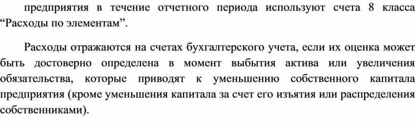 Расходы отражаются на счетах бухгалтерского учета, если их оценка может быть достоверно определена в момент выбытия актива или увеличения обязательства, которые приводят к уменьшению собственного капитала предприятия (кроме уменьшения капитала за счет его изъятия или распределения собственниками).