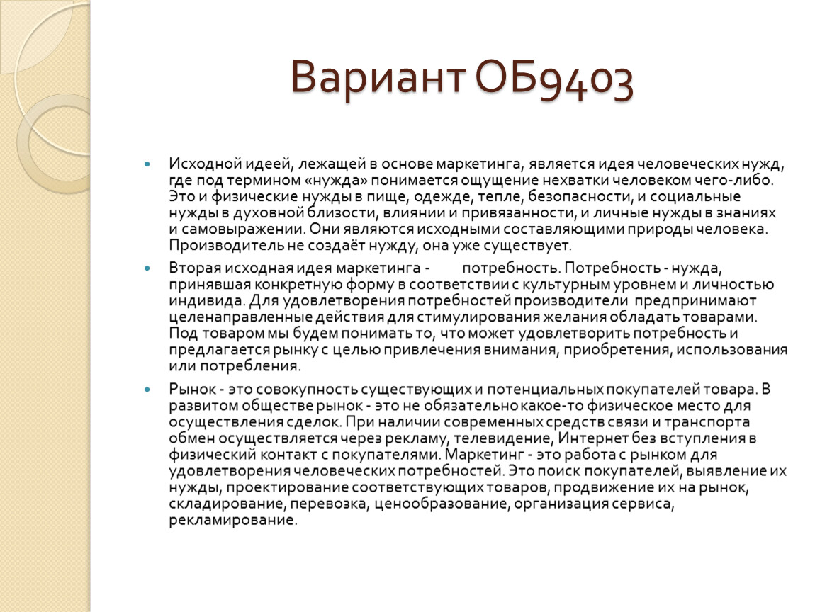Исходной идеей, лежащей в основе маркетинга, является идея человеческих нужд, где под термином «нужда» понимается ощущение нехватки человеком чего-либо. Это и физические нужды в пище, одежде, тепле, безопасности, и социальные нужды в духовной близости, влиянии и привязанности, и личные нужды в знаниях и самовыражении. Они являются исходными составляющими природы человека. Производитель не создаёт нужду, она уже существует.