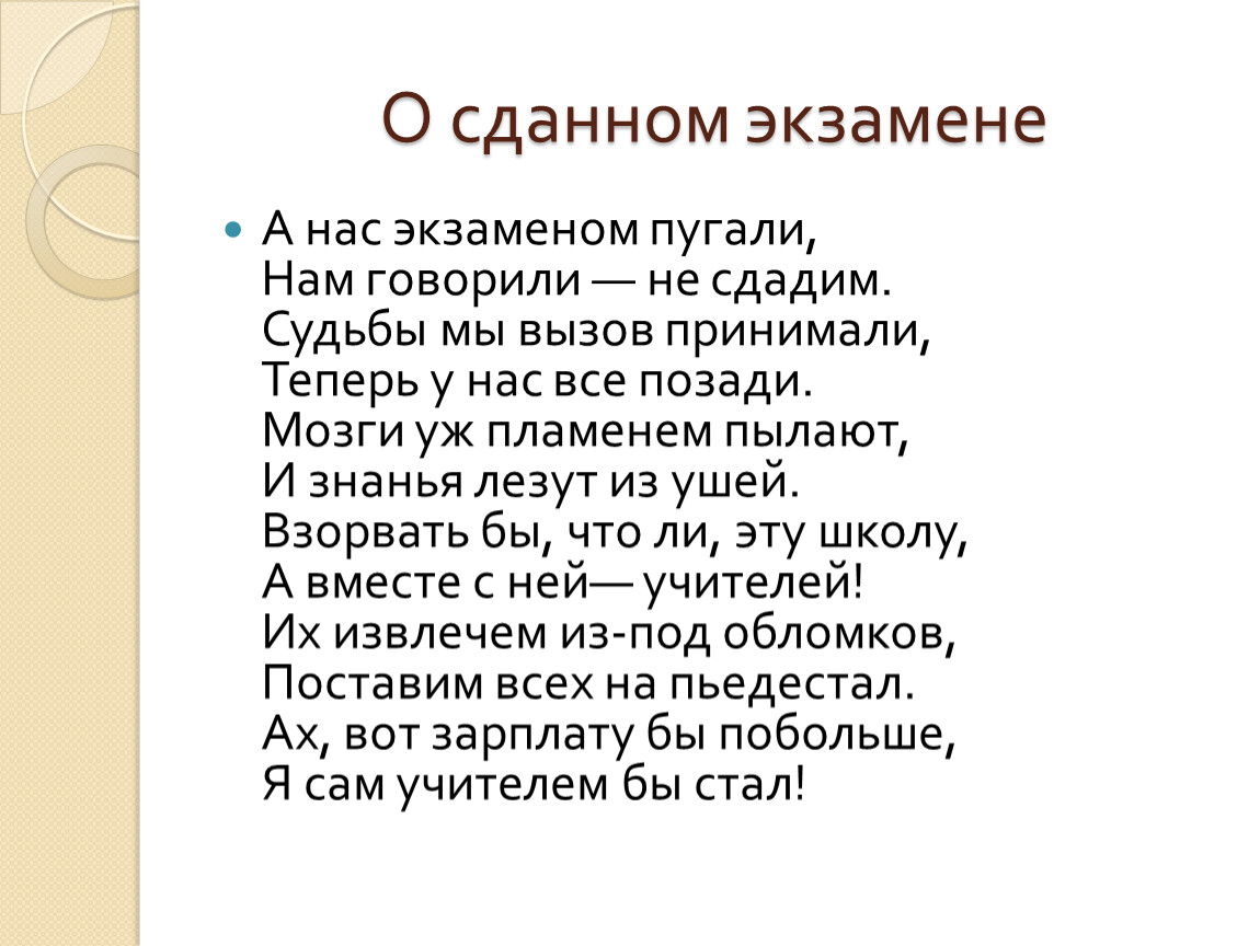 А нас экзаменом пугали,Нам говорили — не сдадим.Судьбы мы вызов принимали,Теперь у нас все позади.Мозги уж пламенем пылают,И знанья лезут из ушей.Взорвать бы, что ли, эту школу,А вместе с ней— учителей!Их извлечем из-под обломков,Поставим всех на пьедестал.Ах, вот зарплату бы побольше,Я сам учителем бы стал!