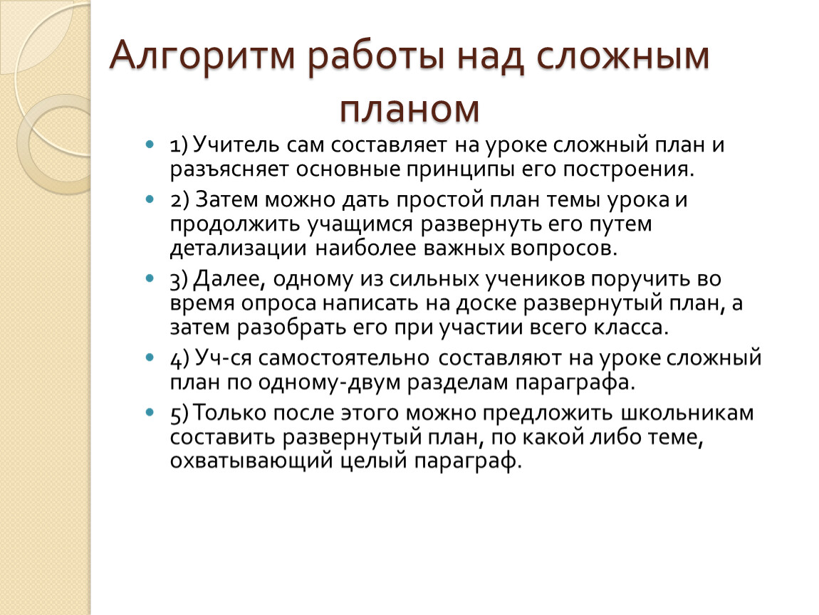 4) Уч-ся самостоятельно составляют на уроке сложный план по одному-двум разделам параграфа.