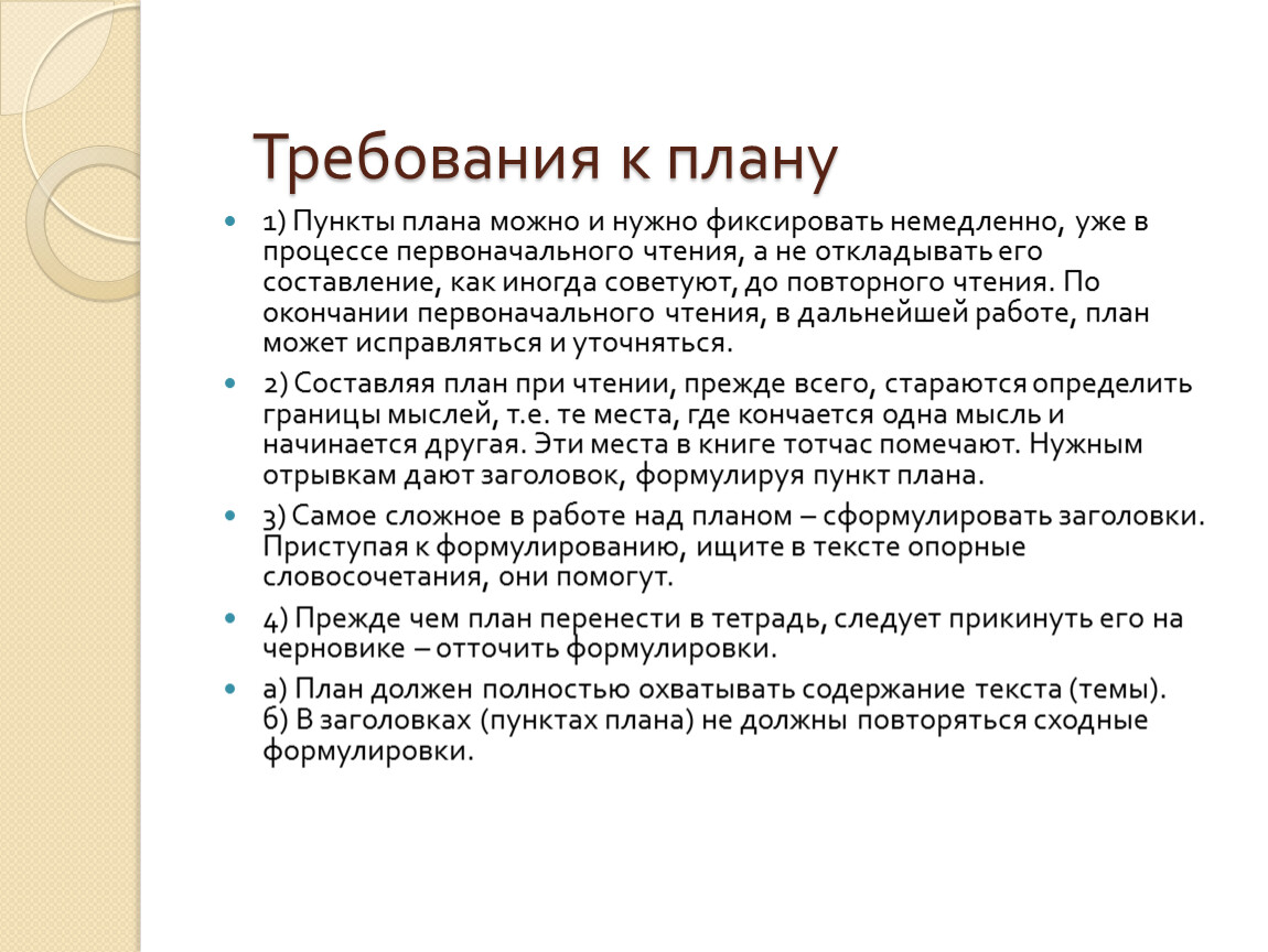 а) План должен полностью охватывать содержание текста (темы).б) В заголовках (пунктах плана) не должны повторяться сходные формулировки.