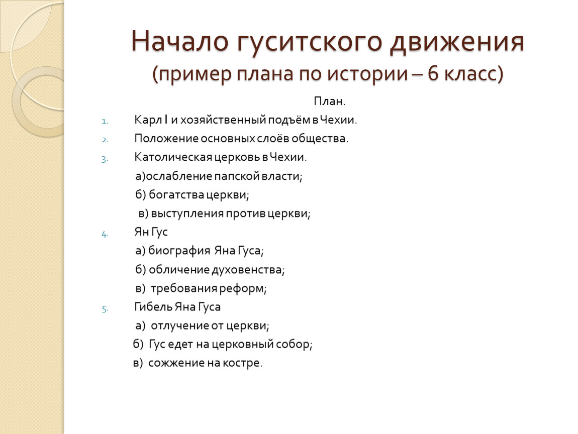 Начало гуситского движения(пример плана по истории – 6 класс)
