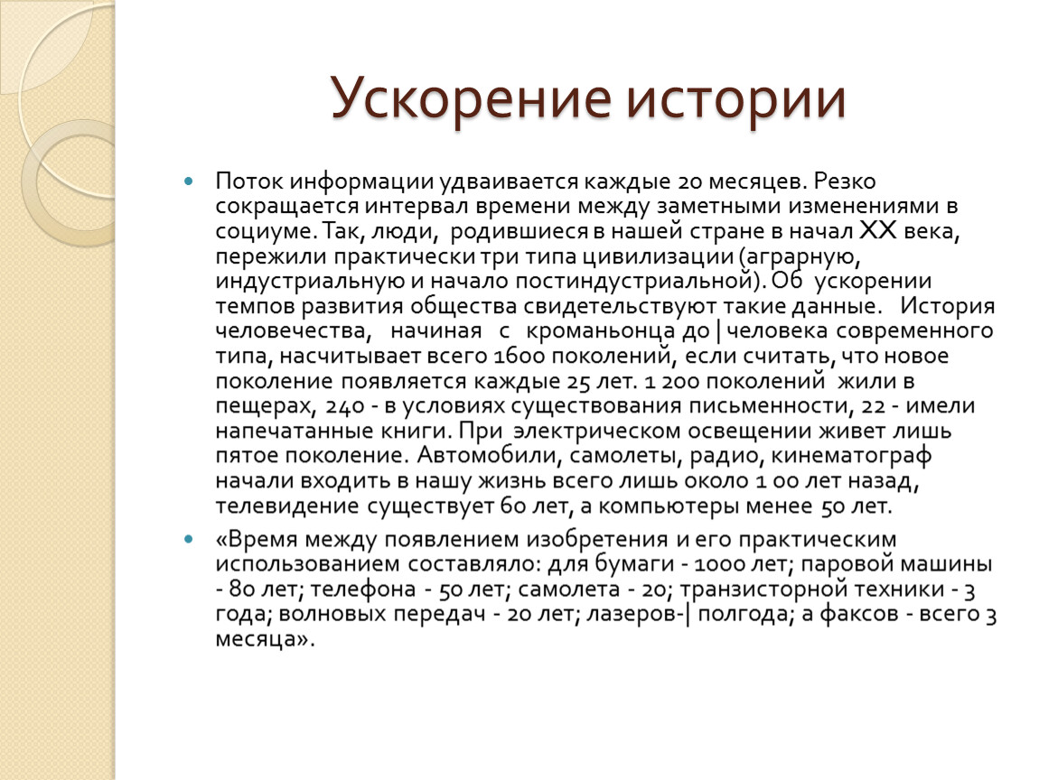 Поток информации удваивается каждые 20 месяцев. Резко сокращается интервал времени между заметными изменениями в социуме. Так, люди, родившиеся в нашей стране в начал XX века, пережили практически три типа цивилизации (аграрную, индустриальную и начало постиндустриальной). Об ускорении темпов развития общества свидетельствуют такие данные. История человечества, начиная с кроманьонца до | человека современного типа, насчитывает всего 1600 поколений, если считать, что новое поколение появляется каждые 25 лет. 1 200 поколений жили в пещерах, 240 - в условиях существования письменности, 22 - имели напечатанные книги. При электрическом освещении живет лишь пятое поколение. Автомобили, самолеты, радио, кинематограф начали входить в нашу жизнь всего лишь около 1 00 лет назад, телевидение существует 60 лет, а компьютеры менее 50 лет.