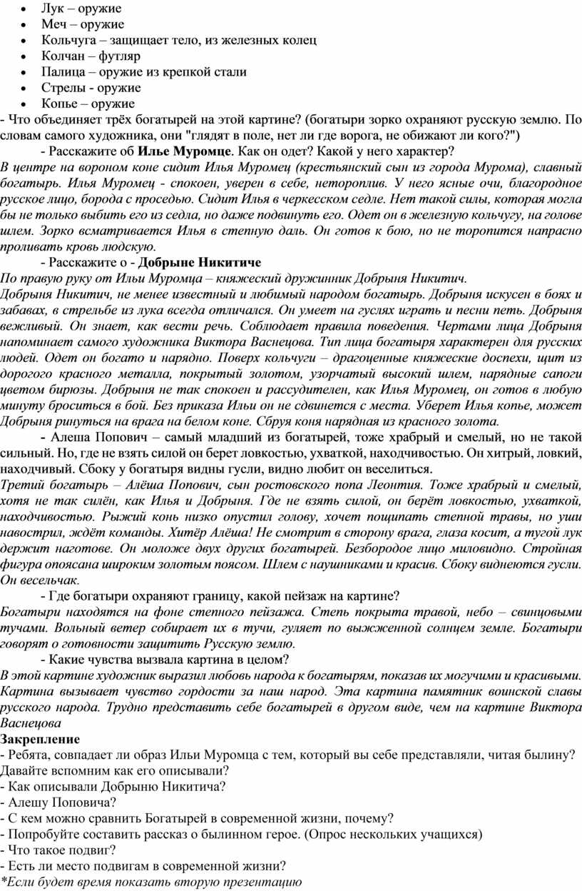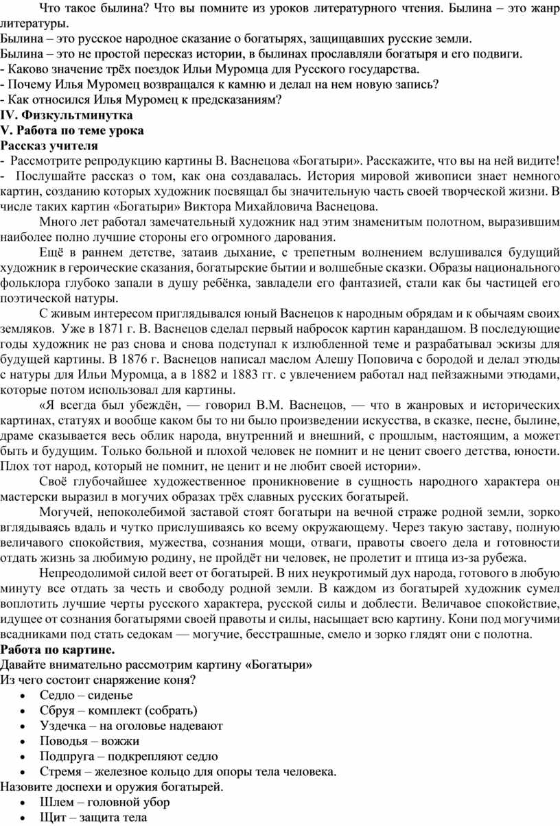 Задачи: обогатить знания о былинах; учить делить текст на части, понимать исторический текст, составлять рассказ о былинном герое, рассказ по картине, находить аналогии с реальными историческими событиями; развивать память, речь, мышление, воображение.
