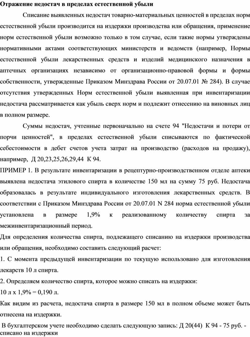 ПРИМЕР 1. В результате инвентаризации в рецептурно-производственном отделе аптеки выявлена недостача этилового спирта в количестве 150 мл на сумму 75 руб. Недостача образовалась в результате индивидуального изготовления лекарственных средств. В соответствии с Приказом Минздрава России от 20.07.01 N 284 норма естественной убыли установлена в размере 1,9% к реализованному количеству спирта за межинвентаризационный период.