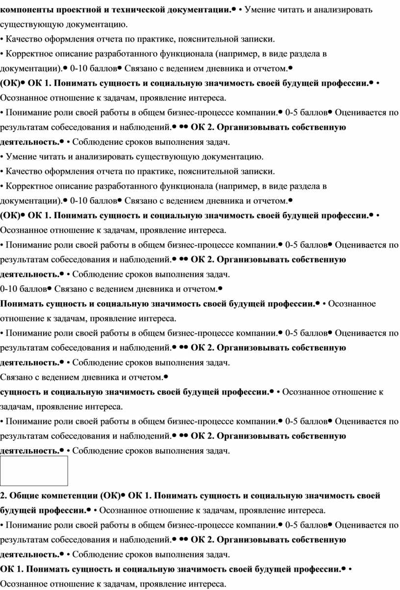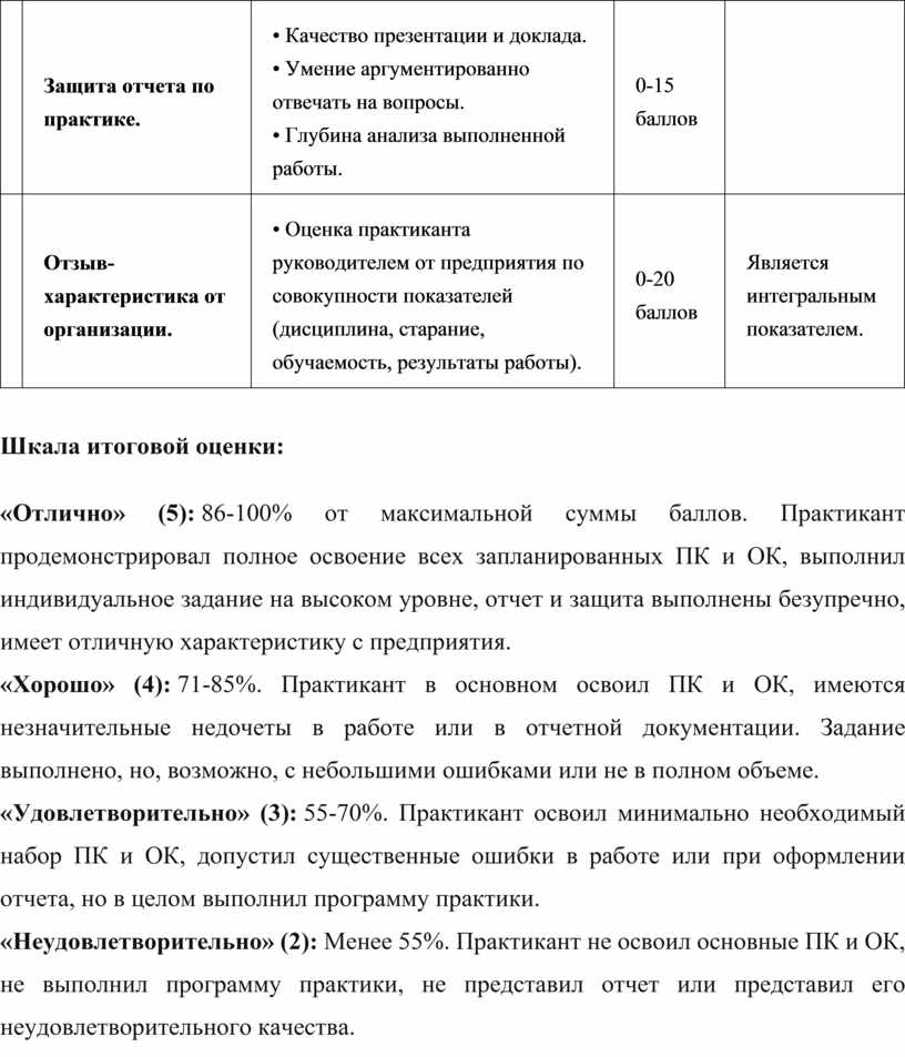 · «Неудовлетворительно» (2): Менее 55%. Практикант не освоил основные ПК и ОК, не выполнил программу практики, не представил отчет или представил его неудовлетворительного качества.
