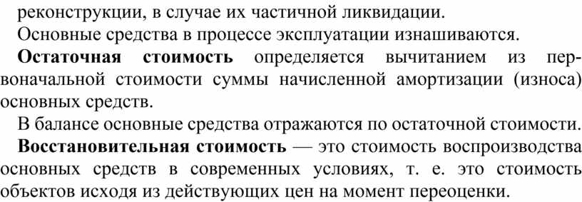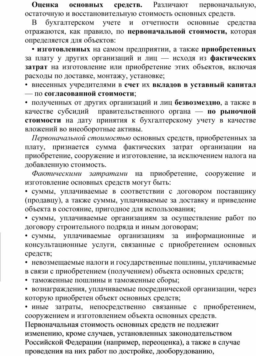 Оценка основных средств. Различают первоначальную, остаточную и восстановительную стоимость основных средств.