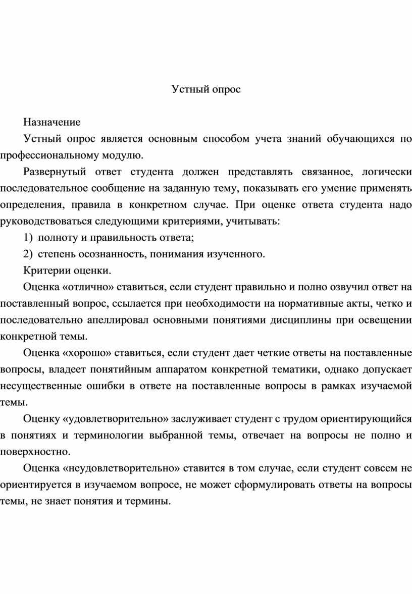 Устный опрос является основным способом учета знаний обучающихся по профессиональному модулю.
