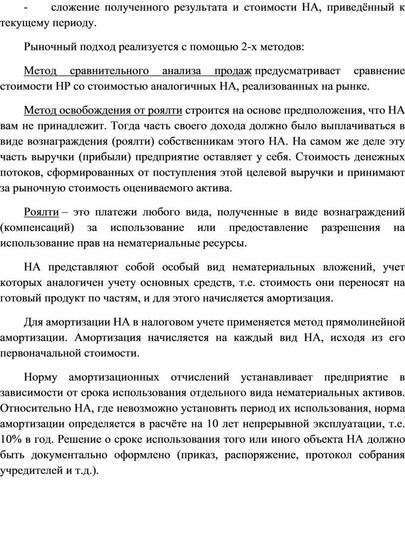 Метод сравнительного анализа продаж предусматривает сравнение стоимости НР со стоимостью аналогичных НА, реализованных на рынке.