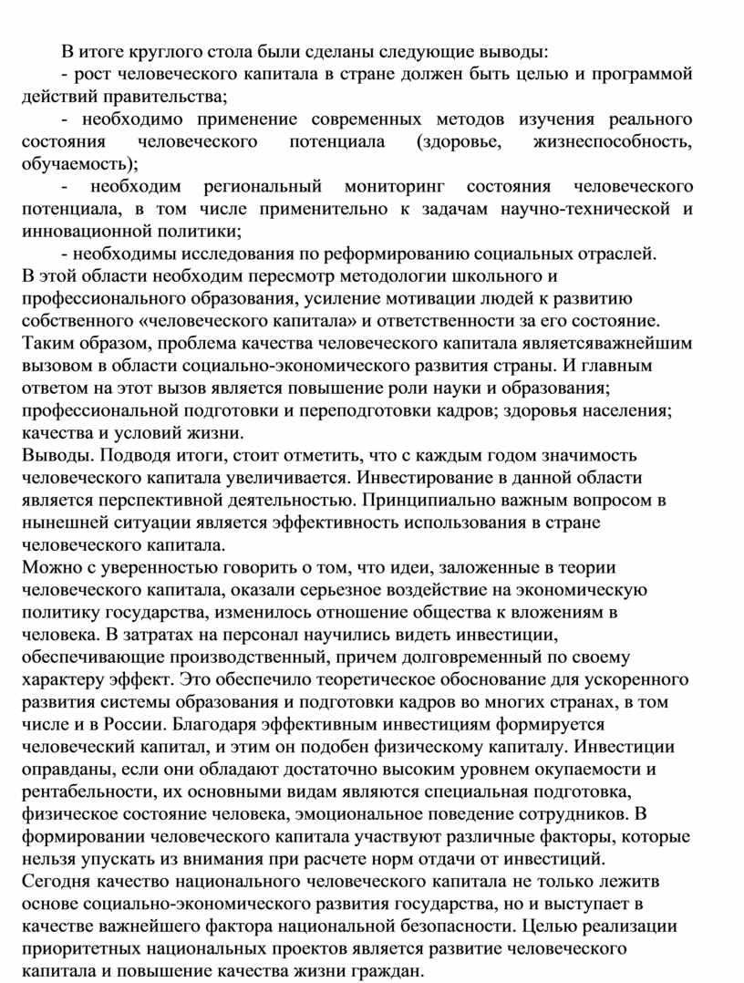 Выводы. Подводя итоги, стоит отметить, что с каждым годом значимость человеческого капитала увеличивается. Инвестирование в данной области является перспективной деятельностью. Принципиально важным вопросом в нынешней ситуации является эффективность использования в стране человеческого капитала.