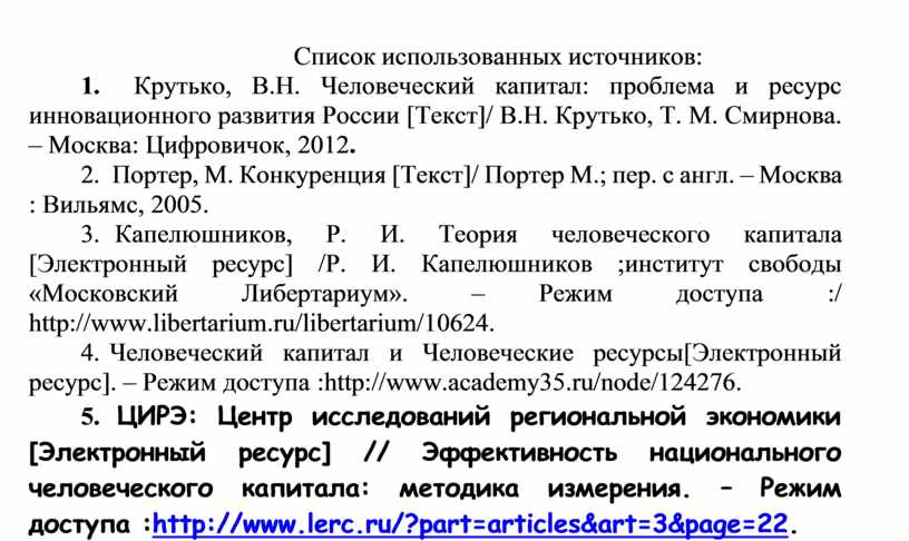 3. Капелюшников, Р. И. Теория человеческого капитала [Электронный ресурс] /Р. И. Капелюшников ;институт свободы «Московский Либертариум». – Режим доступа :/ http://www.libertarium.ru/libertarium/10624.