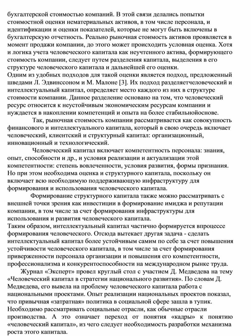 бухгалтерской стоимостью компаний. В этой связи делались попытки стоимостной оценки нематериальных активов, в том числе персонала, и идентификации и оценки показателей, которые не могут быть включены в бухгалтерскую отчетность. Реально рыночная стоимость активов проявляется в момент продажи компании, до этого может происходить условная оценка. Хотя и логика учета человеческого капитала как неучтенного актива, формирующего стоимость компании, следует путем разделения капитала, выделения в его структуре человеческого капитала и дальнейшей его оценки.