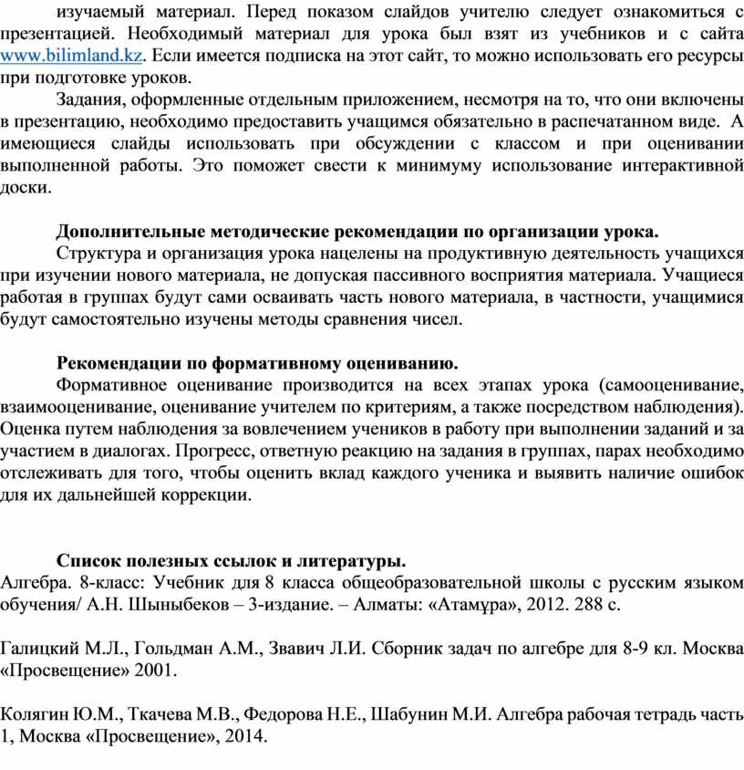 Демонстрация материала осуществляется с помощью презентации PowerPoint. Слайды презентации содержат анимации, которые позволяют поэтапно вывести на экран изучаемый материал. Перед показом слайдов учителю следует ознакомиться с презентацией. Необходимый материал для урока был взят из учебников и с сайта www.bilimland.kz. Если имеется подписка на этот сайт, то можно использовать его ресурсы при подготовке уроков.