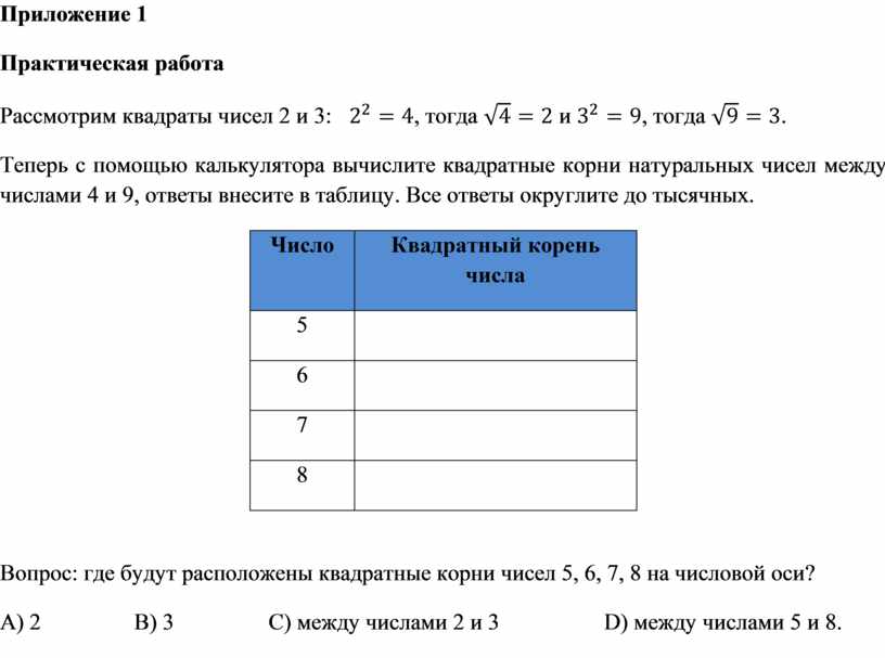 Теперь с помощью калькулятора вычислите квадратные корни натуральных чисел между числами 4 и 9, ответы внесите в таблицу. Все ответы округлите до тысячных.