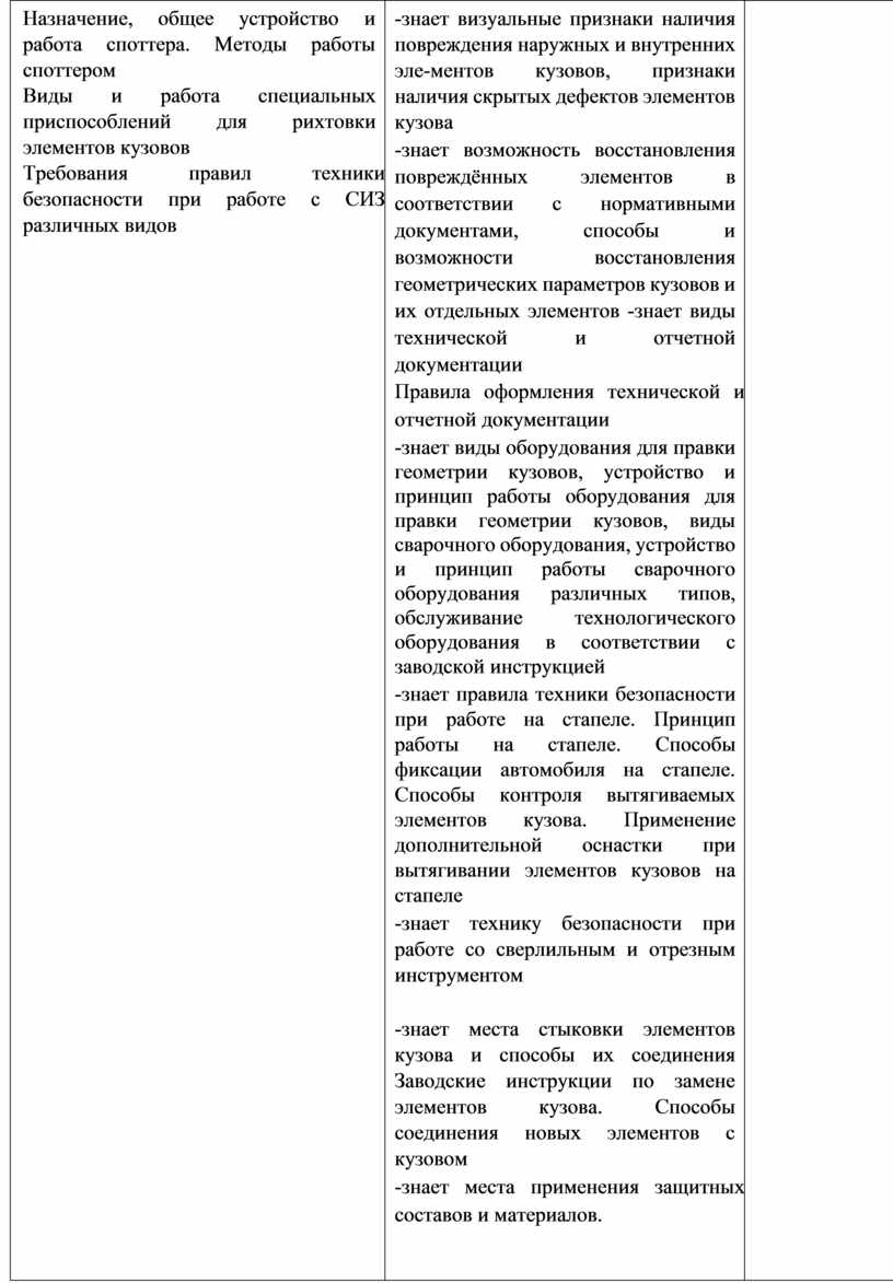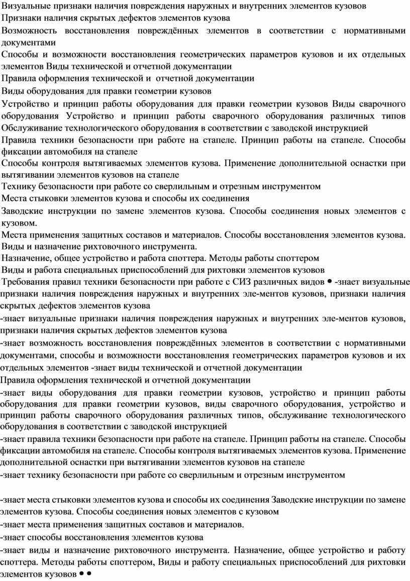 -знает визуальные признаки наличия повреждения наружных и внутренних эле-ментов кузовов, признаки наличия скрытых дефектов элементов кузова -знает возможность восстановления повреждённых элементов в соответствии с нормативными документами, способы и возможности восстановления геометрических параметров кузовов и их отдельных элементов -знает виды технической и отчетной документации Правила оформления технической и отчетной документации -знает виды оборудования для правки геометрии кузовов, устройство и принцип работы оборудования для правки геометрии кузовов, виды сварочного оборудования, устройство и принцип работы сварочного оборудования различных типов, обслуживание технологического оборудования в соответствии с заводской инструкцией -знает правила техники безопасности при работе на стапеле. Принцип работы на стапеле. Способы фиксации автомобиля на стапеле. Способы контроля вытягиваемых элементов кузова. Применение дополнительной оснастки при вытягивании элементов кузовов на стапеле -знает технику безопасности при работе со сверлильным и отрезным инструментом