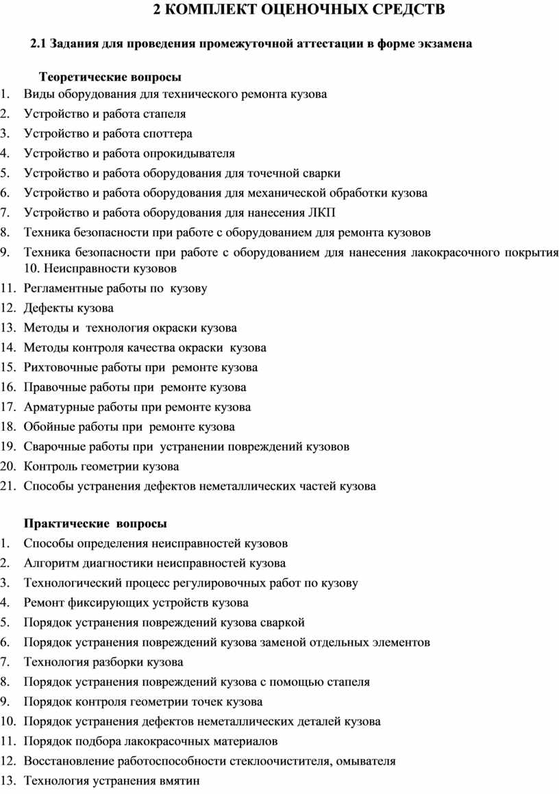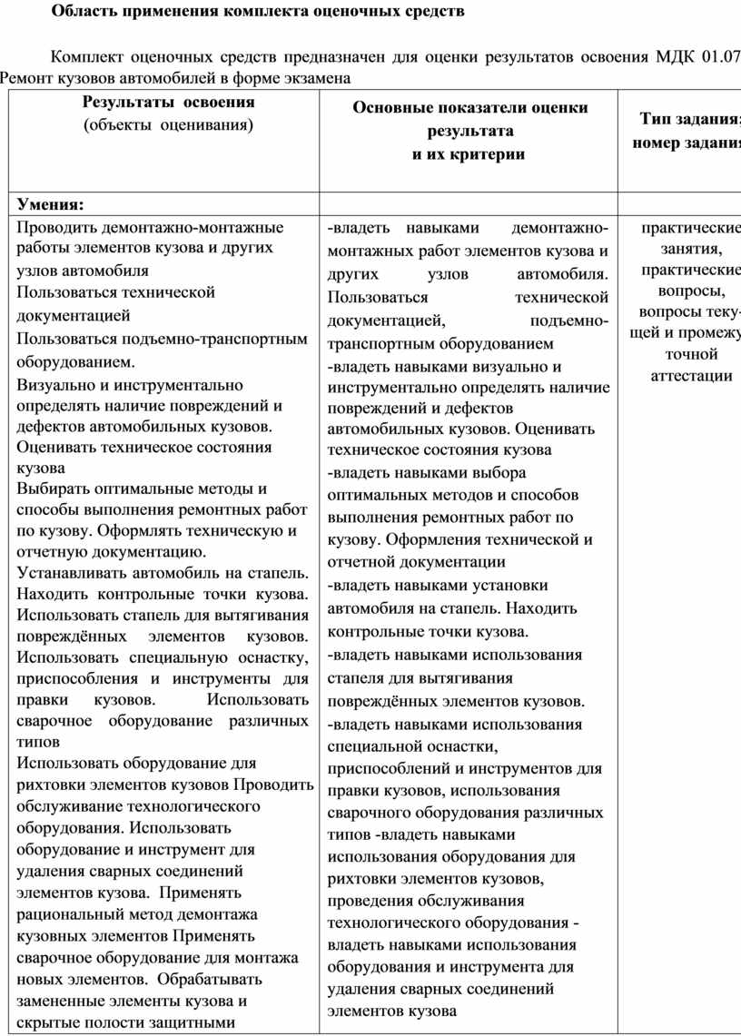 Комплект оценочных средств предназначен для оценки результатов освоения МДК 01.07 Ремонт кузовов автомобилей в форме экзамена