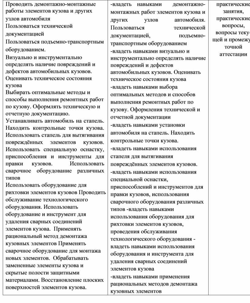 -владеть навыками демонтажно-монтажных работ элементов кузова и других узлов автомобиля. Пользоваться технической документацией, подъемно-транспортным оборудованием -владеть навыками визуально и инструментально определять наличие повреждений и дефектов автомобильных кузовов. Оценивать техническое состояния кузова -владеть навыками выбора оптимальных методов и способов выполнения ремонтных работ по кузову. Оформления технической и отчетной документации -владеть навыками установки автомобиля на стапель. Находить контрольные точки кузова. -владеть навыками использования стапеля для вытягивания повреждённых элементов кузовов. -владеть навыками использования специальной оснастки, приспособлений и инструментов для правки кузовов, использования сварочного оборудования различных типов -владеть навыками использования оборудования для рихтовки элементов кузовов, проведения обслуживания технологического оборудования -владеть навыками использования оборудования и инструмента для удаления сварных соединений элементов кузова -владеть навыками применения рациональных методов демонтажа кузовных элементов |