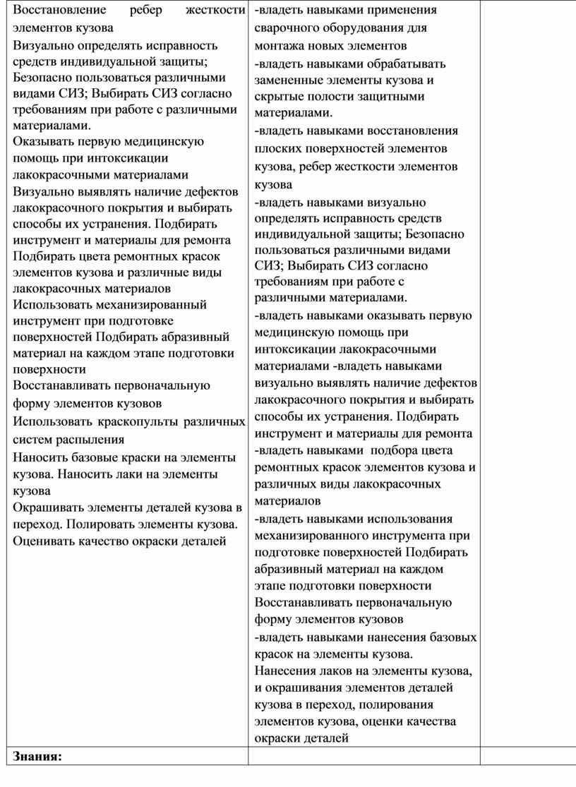 Восстановление ребер жесткости элементов кузова Визуально определять исправность средств индивидуальной защиты; Безопасно пользоваться различными видами СИЗ; Выбирать СИЗ согласно требованиям при работе с различными материалами. Оказывать первую медицинскую помощь при интоксикации лакокрасочными материалами Визуально выявлять наличие дефектов лакокрасочного покрытия и выбирать способы их устранения. Подбирать инструмент и материалы для ремонта Подбирать цвета ремонтных красок элементов кузова и различные виды лакокрасочных материалов Использовать механизированный инструмент при подготовке поверхностей Подбирать абразивный материал на каждом этапе подготовки поверхности Восстанавливать первоначальную форму элементов кузовов Использовать краскопульты различных систем распыления Наносить базовые краски на элементы кузова. Наносить лаки на элементы кузова Окрашивать элементы деталей кузова в переход. Полировать элементы кузова. Оценивать качество окраски деталей |