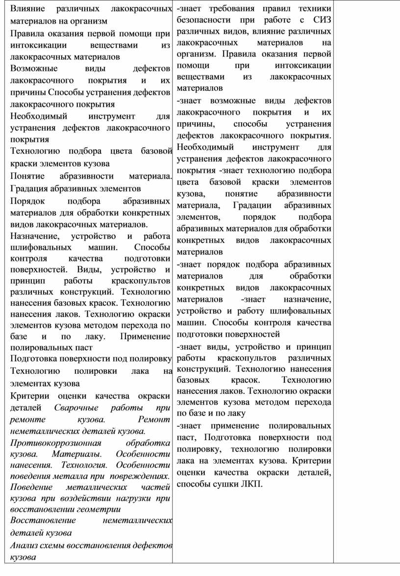 -знает требования правил техники безопасности при работе с СИЗ различных видов, влияние различных лакокрасочных материалов на организм. Правила оказания первой помощи при интоксикации веществами из лакокрасочных материалов -знает возможные виды дефектов лакокрасочного покрытия и их причины, способы устранения дефектов лакокрасочного покрытия. Необходимый инструмент для устранения дефектов лакокрасочного покрытия -знает технологию подбора цвета базовой краски элементов кузова, понятие абразивности материала, Градации абразивных элементов, порядок подбора абразивных материалов для обработки конкретных видов лакокрасочных материалов -знает порядок подбора абразивных материалов для обработки конкретных видов лакокрасочных материалов -знает назначение, устройство и работу шлифовальных машин. Способы контроля качества подготовки поверхностей -знает виды, устройство и принцип работы краскопультов различных конструкций. Технологию нанесения базовых красок. Технологию нанесения лаков. Технологию окраски элементов кузова методом перехода по базе и по лаку -знает применение полировальных паст, Подготовка поверхности под полировку, технологию полировки лака на элементах кузова. Критерии оценки качества окраски деталей, способы сушки ЛКП. |