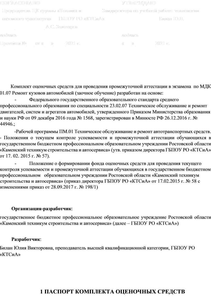 - Положение о формировании фонда оценочных средств для проведения текущего контроля успеваемости и промежуточной аттестации обучающихся в государственном бюджетном профессиональном образовательном учреждении Ростовской области «Каменский техникум строительства и автосервиса» (приказ директора ГБПОУ РО «КТСиА» от 17.02.2015 г. № 58 с изменениями приказ от 28.09.2017 г. № 198/1)