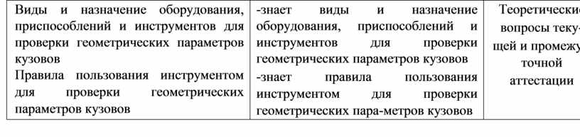 -знает виды и назначение оборудования, приспособлений и инструментов для проверки геометрических параметров кузовов -знает правила пользования инструментом для проверки геометрических пара-метров кузовов |