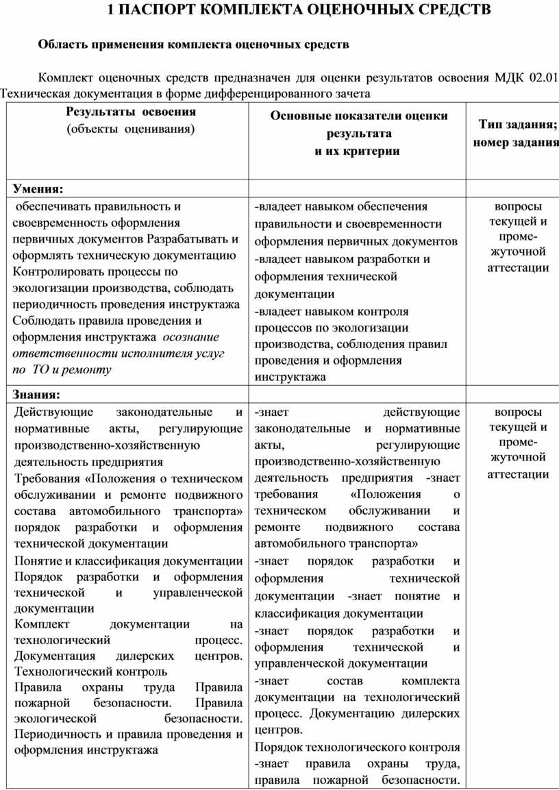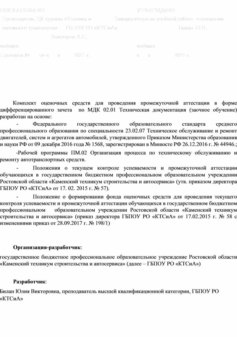 Комплект оценочных средств для проведения промежуточной аттестации в форме дифференцированного зачета по МДК 02.01 Техническая документация (заочное обучение) разработан на основе: