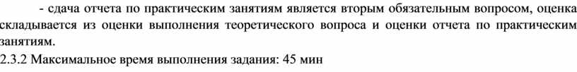 - сдача отчета по практическим занятиям является вторым обязательным вопросом, оценка складывается из оценки выполнения теоретического вопроса и оценки отчета по практическим занятиям.