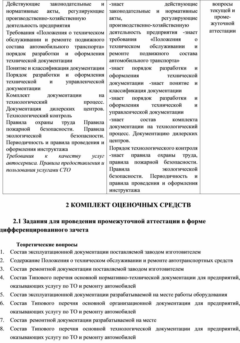 Действующие законодательные и нормативные акты, регулирующие производственно-хозяйственную деятельность предприятия Требования «Положения о техническом обслуживании и ремонте подвижного состава автомобильного транспорта» порядок разработки и оформления технической документации Понятие и классификация документации Порядок разработки и оформления технической и управленческой документации Комплект документации на технологический процесс. Документация дилерских центров. Технологический контроль Правила охраны труда Правила пожарной безопасности. Правила экологической безопасности. Периодичность и правила проведения и оформления инструктажа Требования к качеству услуг автосервиса. Правила предоставления и пользования услугами СТО |
