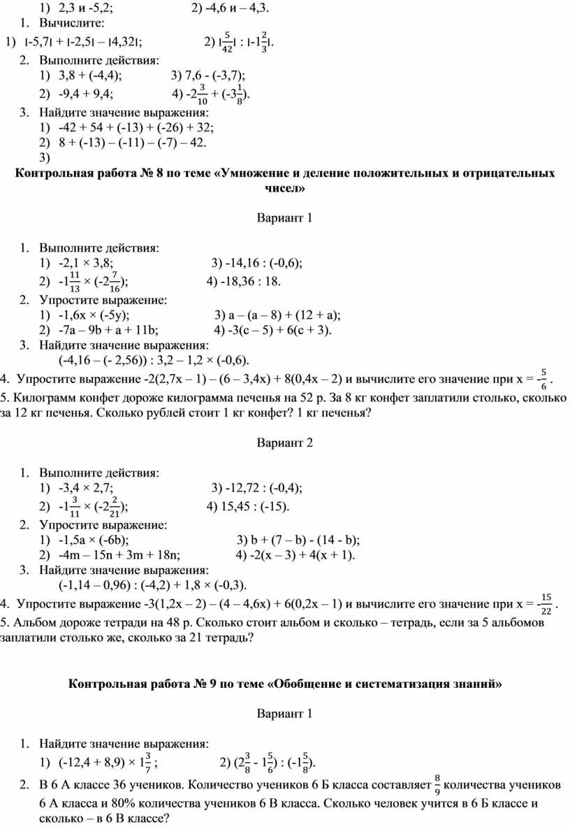 Контрольная работа № 8 по теме «Умножение и деление положительных и отрицательных чисел»