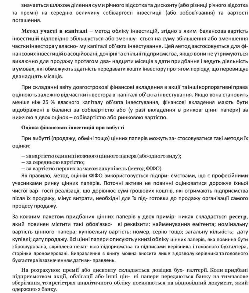 Метод участі в капіталі – метод обліку інвестицій, згідно з яким балансова вартість інвестицій відповідно збільшується або зменшу- ється на суму збільшення або зменшення частки інвестора у власно- му капіталі об’єкта інвестування. Цей метод застосовується для фі- нансових інвестицій в асоційовані, дочірні та спільні підприємства, якщо вони не утримуються виключно для продажу протягом два- надцяти місяців з дати придбання і ведуть діяльність в умовах, які обмежують здатність передавати кошти інвестору протягом періоду, що перевищує дванадцять місяців.