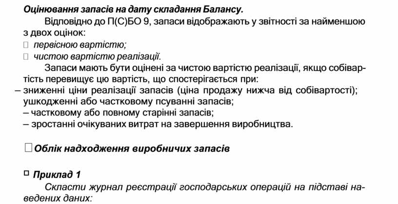 Відповідно до П(С)БО 9, запаси відображають у звітності за найменшою з двох оцінок: