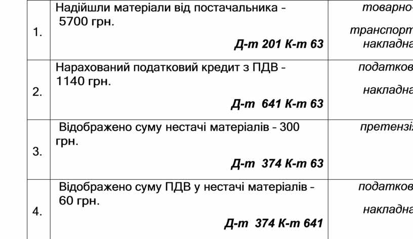 За супровідними документами поставка матеріалів передбачена на суму 6000 грн., сума ПДВ – 1200 грн. При прийманні матеріалів встанов- лена нестача з вини постачальника ТзОВ “Гранд" на суму 300 грн., сума ПДВ – 60 грн. Поставка проведена без передоплати. Претензія покупця АТ "Промінь" задоволена, матеріал допоставлено в кількості, зазначеній у рахунку-фактурі й договорі.