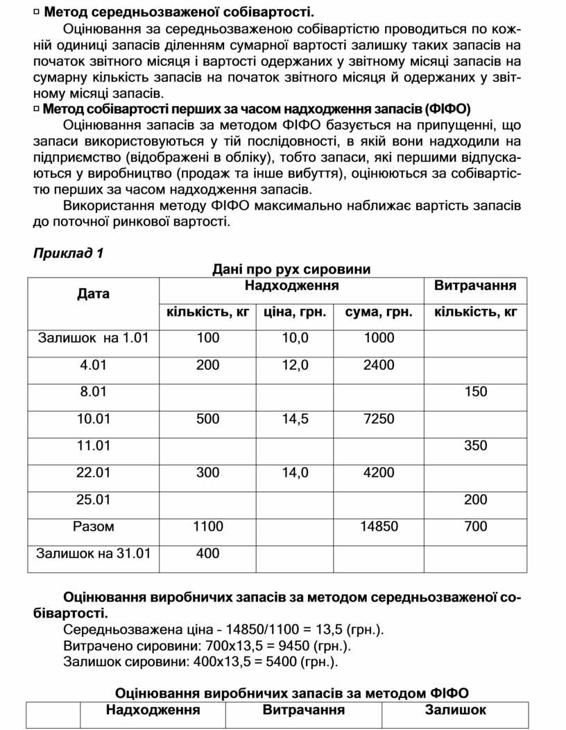 Оцінювання за середньозваженою собівартістю проводиться по кож- ній одиниці запасів діленням сумарної вартості залишку таких запасів на початок звітного місяця і вартості одержаних у звітному місяці запасів на сумарну кількість запасів на початок звітного місяця й одержаних у звіт- ному місяці запасів.