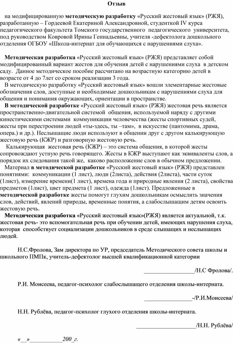 на модифицированную методическую разработку «Русский жестовый язык» (РЖЯ), разработанную – Гордеевой Екатериной Александровной, студенткой IV курса педагогического факультета Томского государственного педагогического университета, под руководством Ковровой Ирины Геннадьевны, учителя -дефектолога дошкольного отделения ОГБОУ «Школа-интернат для обучающихся с нарушениями слуха».