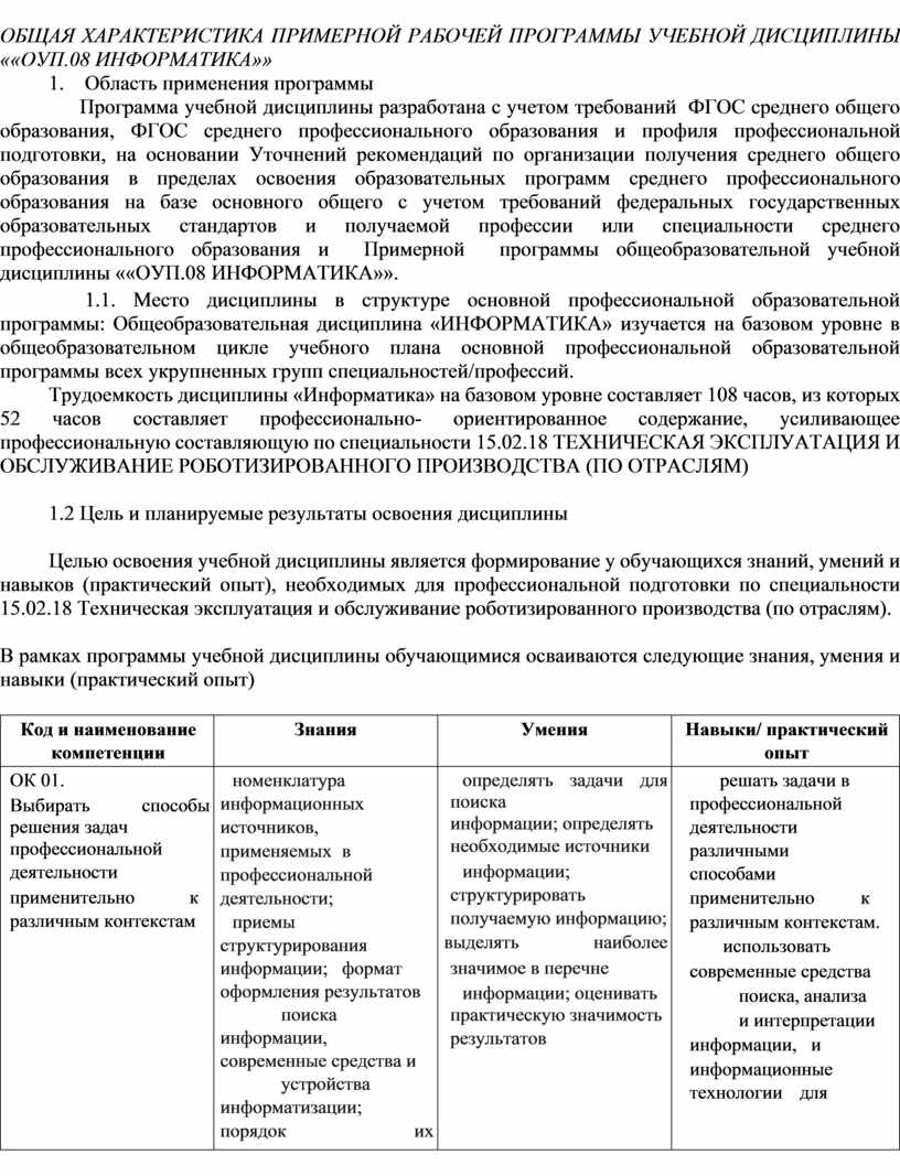 ОБЩАЯ ХАРАКТЕРИСТИКА ПРИМЕРНОЙ РАБОЧЕЙ ПРОГРАММЫ УЧЕБНОЙ ДИСЦИПЛИНЫ ««ОУП.08 ИНФОРМАТИКА»»