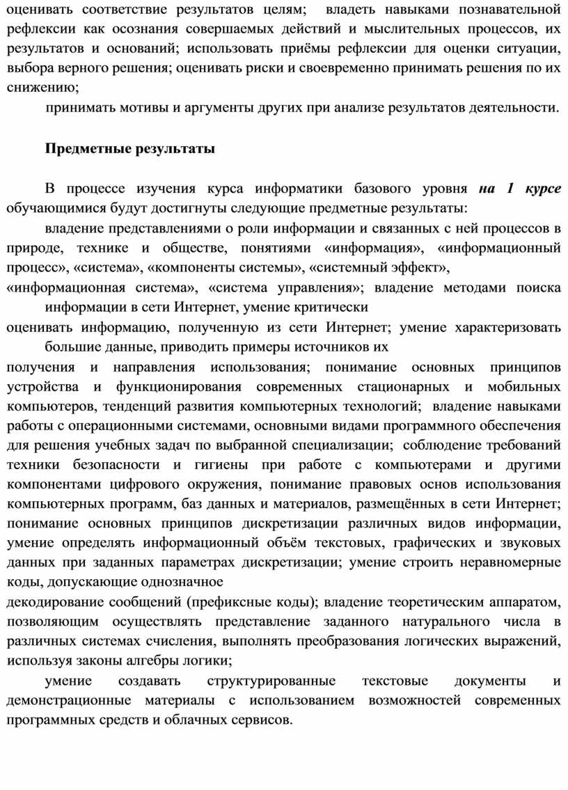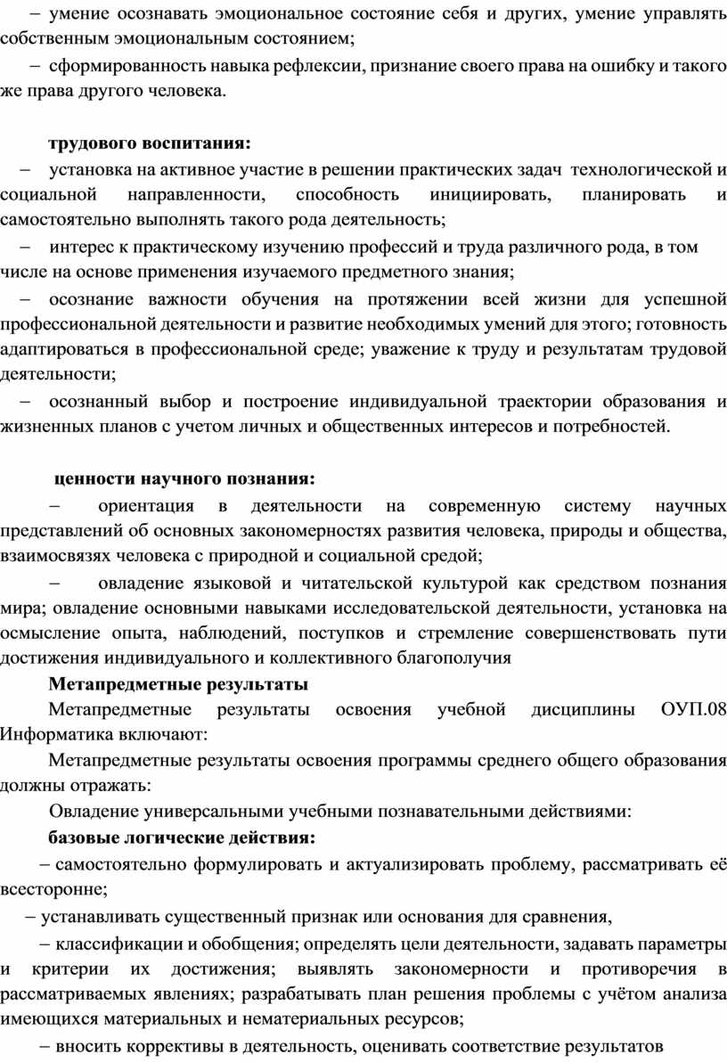 1.1. Место дисциплины в структуре основной профессиональной образовательной программы: Общеобразовательная дисциплина «ИНФОРМАТИКА» изучается на базовом уровне в общеобразовательном цикле учебного плана основной профессиональной образовательной программы всех укрупненных групп специальностей/профессий.