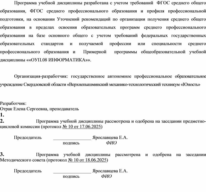 Программа учебной дисциплины разработана с учетом требований ФГОС среднего общего образования, ФГОС среднего профессионального образования и профиля профессиональной подготовки, на основании Уточнений рекомендаций по организации получения среднего общего образования в пределах освоения образовательных программ среднего профессионального образования на базе основного общего с учетом требований федеральных государственных образовательных стандартов и получаемой профессии или специальности среднего профессионального образования и Примерной программы общеобразовательной учебной дисциплины ««ОУП.08 ИНФОРМАТИКА»».