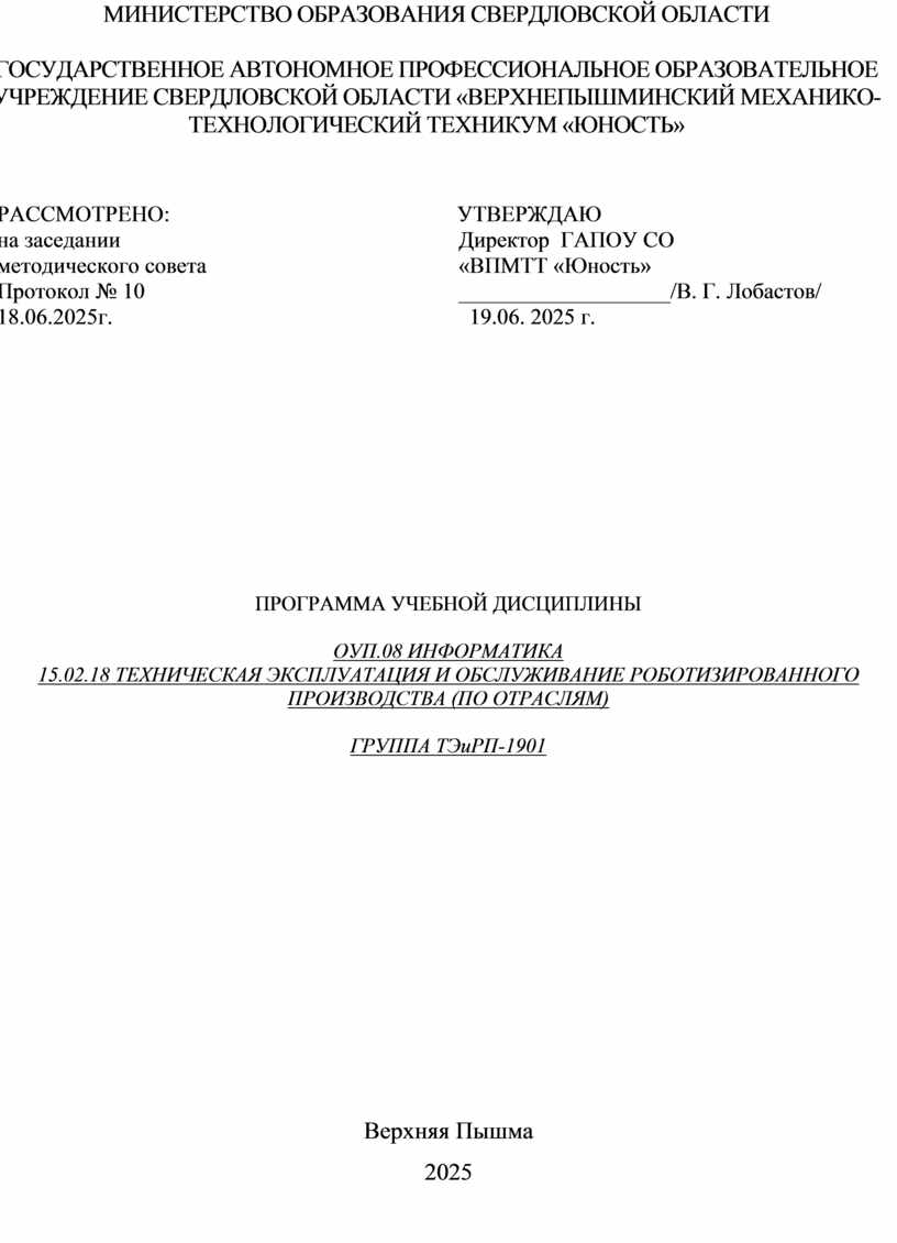 УтверждАю Директор ГАПОУ СО «ВПМТТ «Юность» ___________________/В. Г. Лобастов/ 19.06. 2025 г. |
