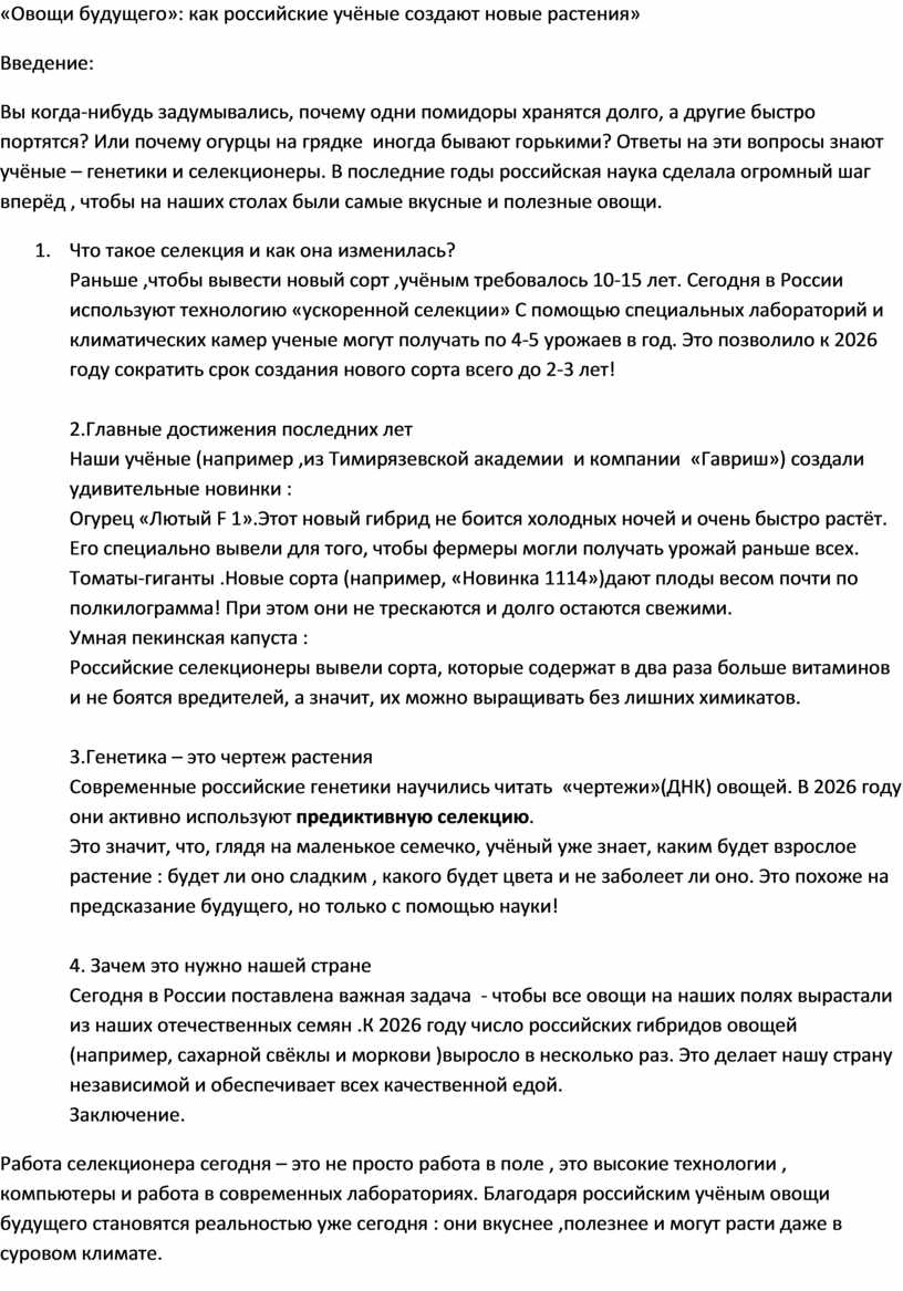 Работа селекционера сегодня – это не просто работа в поле , это высокие технологии , компьютеры и работа в современных лабораториях. Благодаря российским учёным овощи будущего становятся реальностью уже сегодня : они вкуснее ,полезнее и могут расти даже в суровом климате.