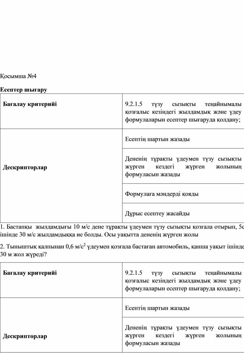 9.2.1.5 түзу сызықты теңайнымалы қозғалыс кезіндегі жылдамдық және үдеу формулаларын есептер шығаруда қолдану; |