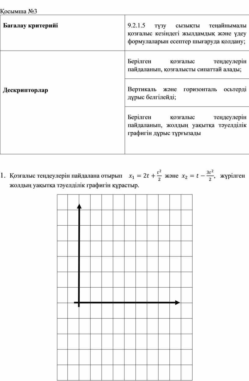 Берілген қозғалыс теңдеулерін пайдаланып, жолдың уақытқа тәуелділік графигін дұрыс тұрғызады |