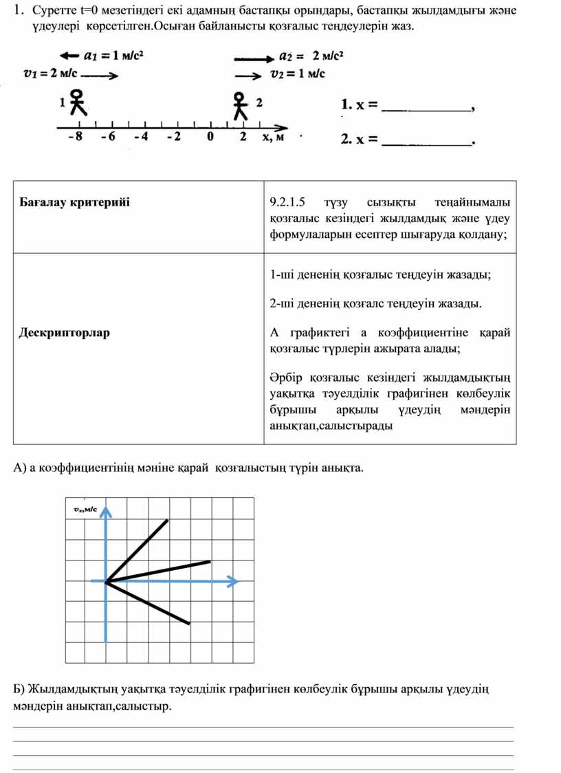 1-ші дененің қозғалыс теңдеуін жазады; 2-ші дененің қозғалс теңдеуін жазады. А графиктегі а коэффициентіне қарай қозғалыс түрлерін ажырата алады; Әрбір қозғалыс кезіндегі жылдамдықтың уақытқа тәуелділік графигінен көлбеулік бұрышы арқылы үдеудің мәндерін анықтап,салыстырады |