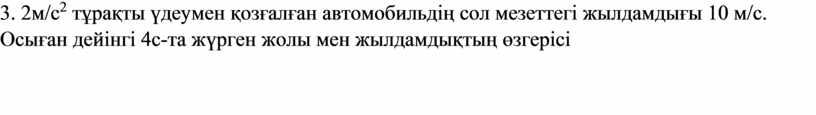 3. 2м/с2 тұрақты үдеумен қозғалған автомобильдің сол мезеттегі жылдамдығы 10 м/с. Осыған дейінгі 4с-та жүрген жолы мен жылдамдықтың өзгерісі