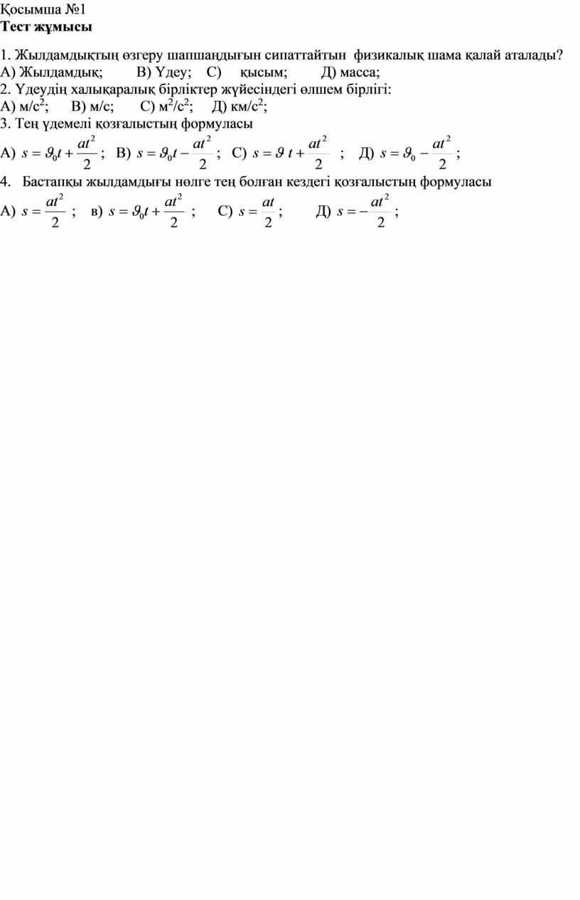 1. Бастапқы жылдамдығы 10 м/с дене тұрақты үдеумен түзу сызықты қозғала отырып, 5с ішінде 30 м/с жылдамдыққа ие болды. Осы уақытта дененің жүрген жолы