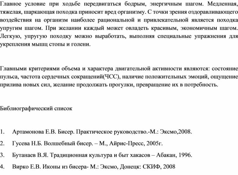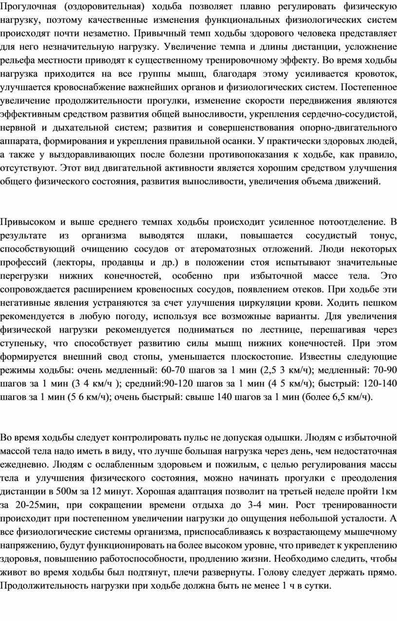 Двигательная деятельность весьма разнообразна. Выбор конкретных видов физических упражнений во многом зависит от склонностей каждого человека, его индивидуальных особенностей. При подборе того или иного вида физической активности необходимо руководствоваться ее оздоровительной направленностью. Любое двигательное действие оказывает положительное влияние, если оно отвечает следующим требованиям: всестороннее воздействие на организм, доступность, безопасность, постепенное повышение нагрузки, положительное эмоциональное состояние. Существует множество физических упражнений, характеризующихся различным воздействием на организм. Одним из самых простых видов двигательной деятельности, основанной на естественных движениях человека, является ходьба.