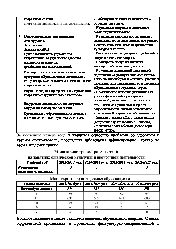 направления (Уроки здоровья, «Спортивные танцы»), занятия в спортивных