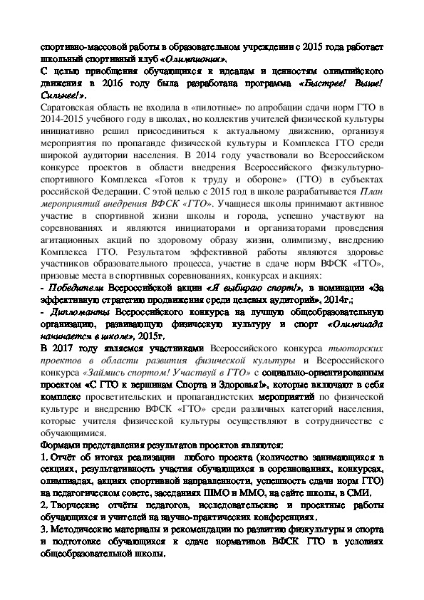 олимпиадах, акциях спортивной направленности, успешность сдачи норм ГТО)